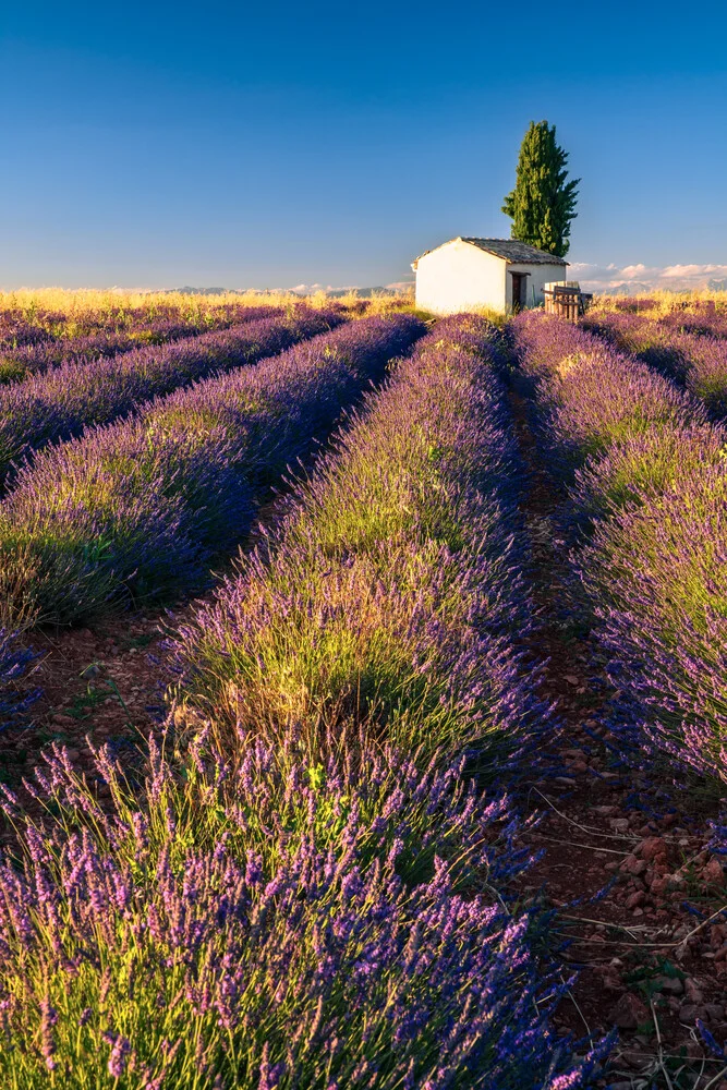 Wunderschönes Lavendelfeld in Südfrankreich während der goldenen Stunde.