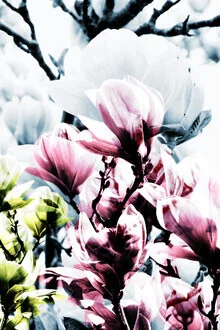 Wandbild mit geometrischen Magnolienblüten und Blättern in sanften Farben.