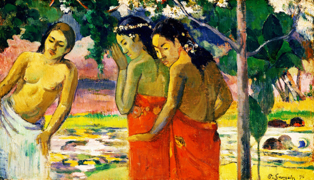 Mockup Illustration von Paul Gauguin: drei Frauen in traditionellen tahitianischen Kleidern