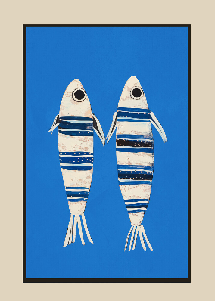 Minimalistisches Wandbild mit einem Fisch auf blauem Hintergrund von Branka Kodžoman