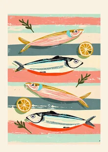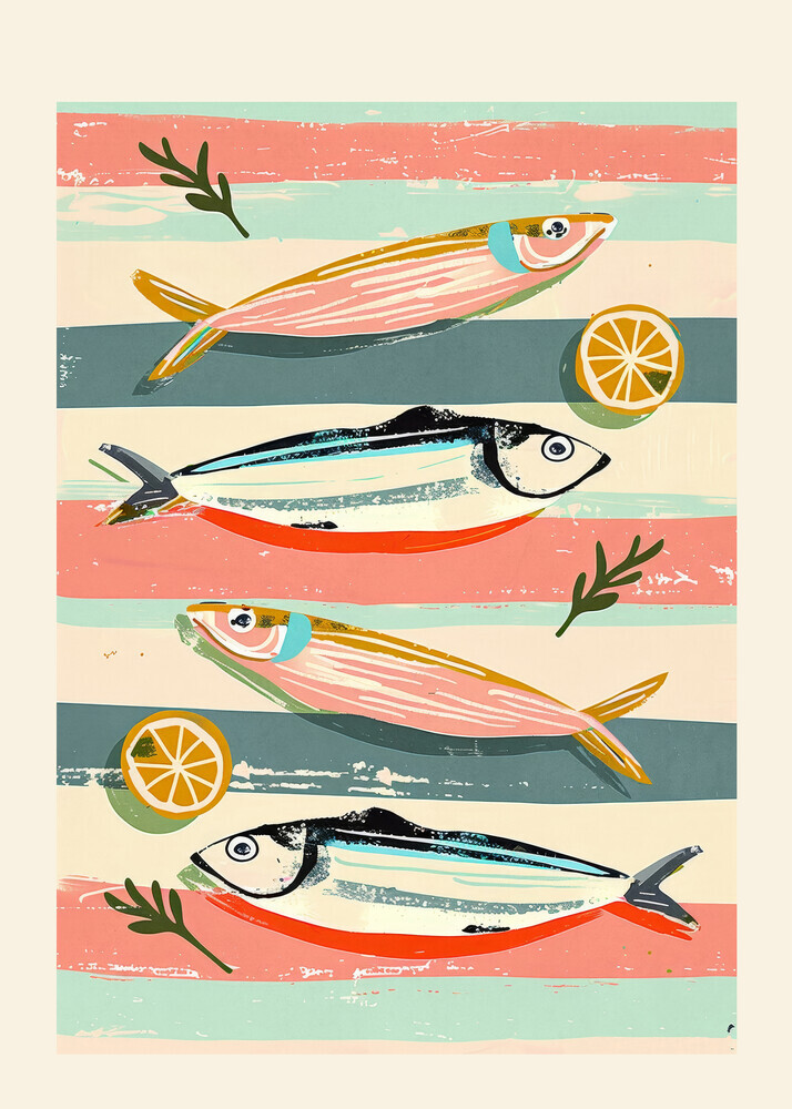 Wandbild mit Sardinen auf gestreiftem Hintergrund, lebendige Farben und minimalistischer Stil.