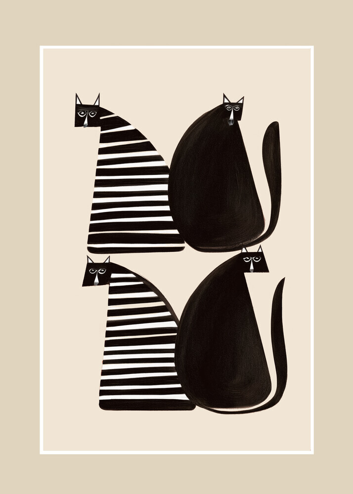 Minimalistische Illustration von Katzen in Schwarz und Weiß, verspielt und stilvoll.