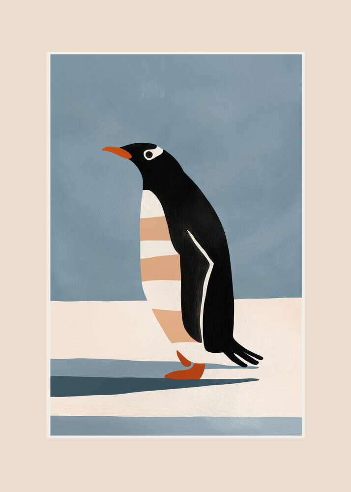 Illustration eines Pinguins auf Eis, zeigt ruhige, klare Farben und eine minimalistische Komposition