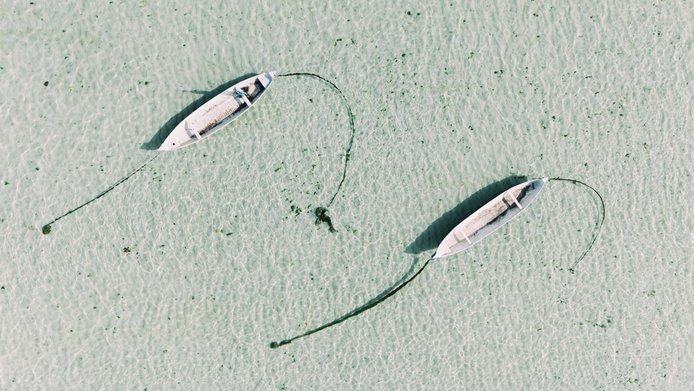 Diese ruhige Luftaufnahme zeigt zwei Boote, die sanft auf dem azurblauen Wasser von Nusa Lembongan in Indonesien treiben. Die harmonische Komposition wird von verschiedenen Grüntönen umrahmt, die die üppige Vegetation der Umgebung widerspiegeln. Die klare Sicht von oben schafft eine entspannte Atmosphäre und lädt dazu ein, in die friedliche Szenerie einzutauchen. Ideal für jeden Raum, der eine ruhige und beruhigende Stimmung vermitteln soll.