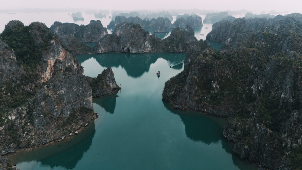 Dieses Bild zeigt ein einzelnes Boot, das sanft auf den ruhigen Gewässern von Ha Long Bay treibt. Umgeben von majestätischen Bergen und einer friedlichen Atmosphäre vermittelt die Komposition ein Gefühl von Einsamkeit und Gelassenheit. Die sanften Grüntöne des Wassers harmonieren wunderbar mit dem silbernen Licht, das die Szene durchflutet. Diese harmonische Farbpalette lädt dazu ein, sich in Gedanken zu verlieren und die Schönheit der Natur zu genießen.