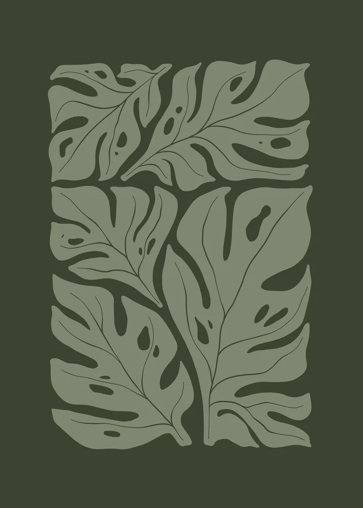 Illustration mit Monstera-Blättern in sanften Grüntönen, minimalistischer Stil.
