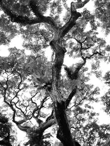Schwarz-Weiß Fotografie eines Baumes mit dramatischen Ästen und organischer Struktur