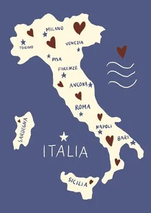 Karte von Italien, die in sanften Blautönen und Herzen gestaltet ist.