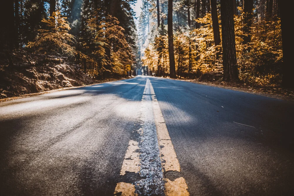 Fotokunst von Jessica Wiedemann: herbstliche Straße in Kalifornien mit orangefarbenen Blättern