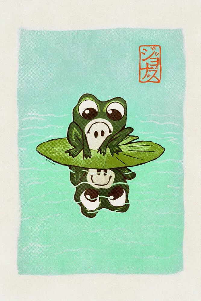Illustration eines Frosches auf einem Seerosenblatt, verspielte und ruhige Stimmung.