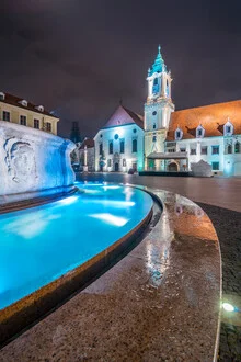 Nachtaufnahme von Bratislava: beleuchtetes Rathaus am Hauptplatz