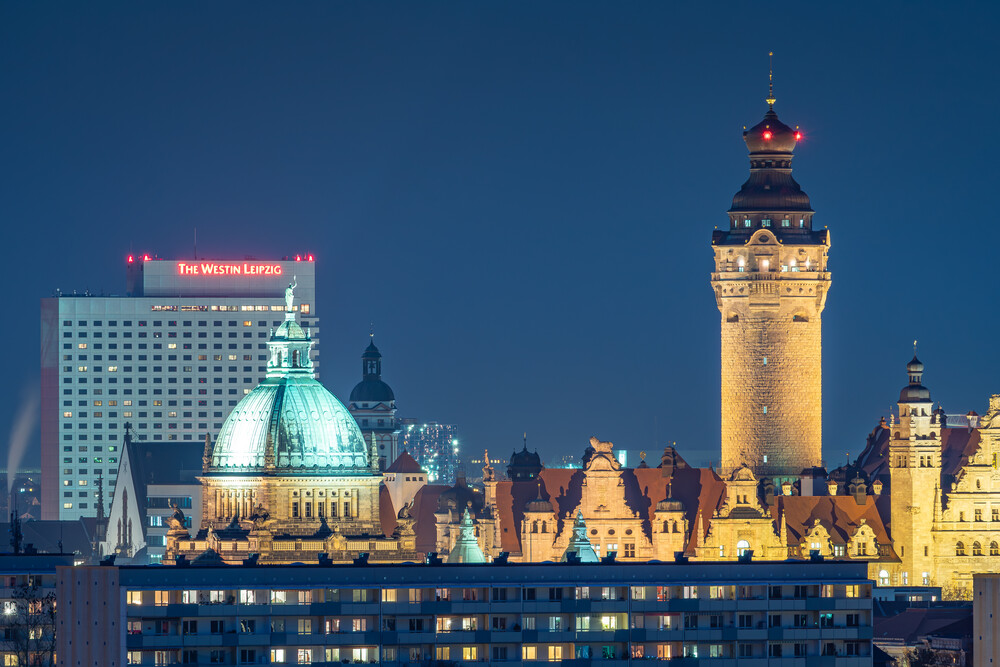 Fotokunst von Martin Wasilewski: Abendstimmung über Leipzig mit historischen Gebäuden