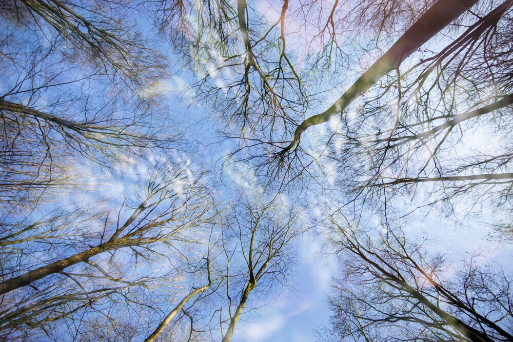 Doppelbelichtung von Wald und Himmel, sanfte Farben und harmonische Komposition.