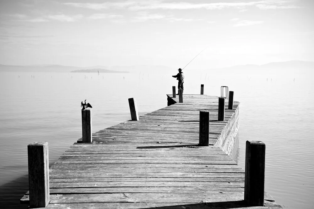Fotokunst von Oliver Buchmann: Fischer am Nebel bedeckten Lago Trasimeno