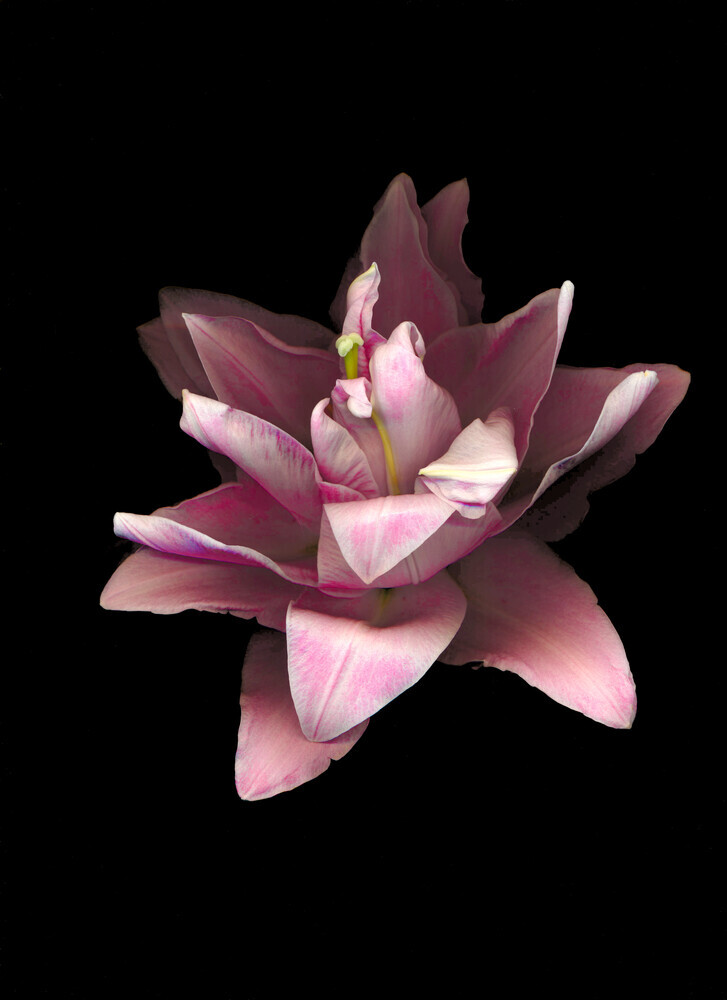 Eine Lilie in zartem Rosa öffnet ihre Blütenblätter wie eine Bühne der Eleganz. Die feinen Farbnuancen und die sanft geschwungenen Formen verleihen ihr eine fast majestätische Ausstrahlung. Vor dem tiefschwarzen Hintergrund erstrahlt sie wie eine Skulptur der Natur – ein Symbol für Reinheit, Schönheit und stille Stärke.