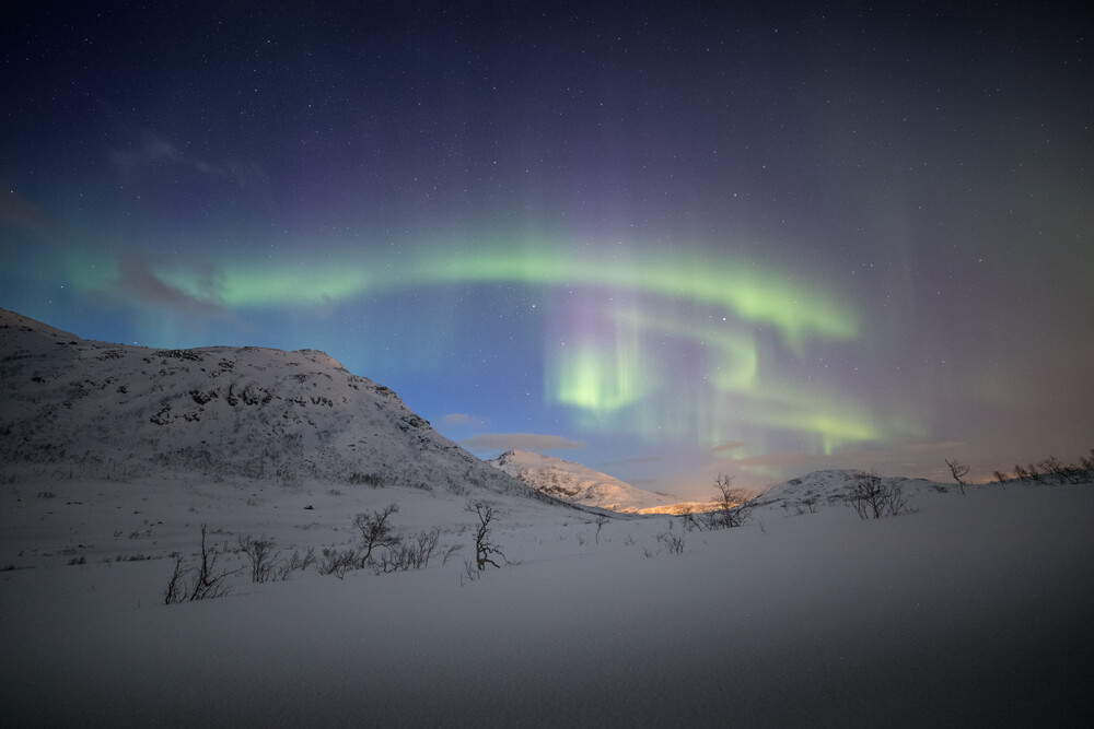 Fotokunst von Sebastian Worm: winterliche Szene mit schneebedeckten Bergen und Polarlichtern