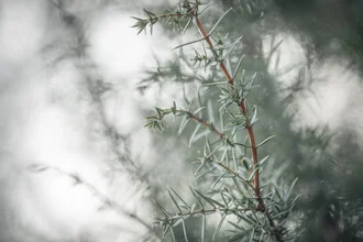 Fotografie eines Wacholders mit feinen, grünen Nadeln in sanftem Licht.