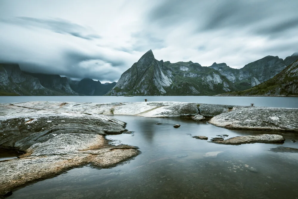 Fotokunst von Sebastian Worm: ruhige Landschaft mit norwegischem Fjord und Bergen