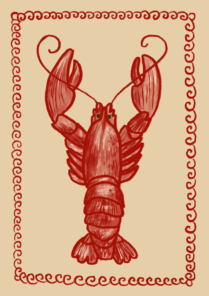 Illustration eines Aragosta-Hummers in lebhaften Farben, fröhliche Stimmung.