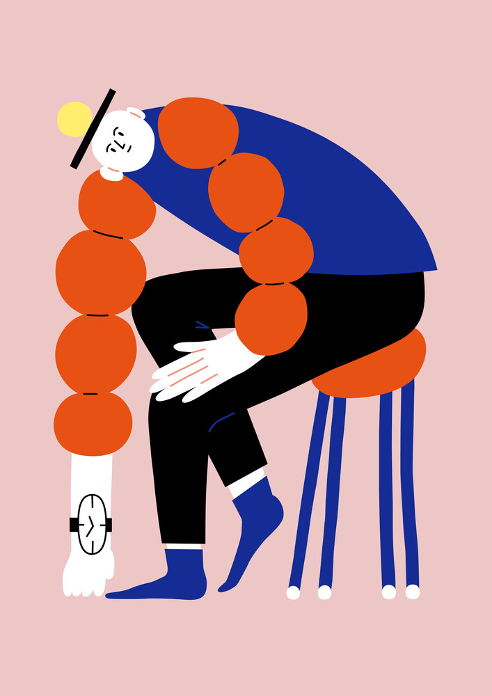 Illustration von Susann Stefanizen: Mann sitzt auf einem Hocker und wartet gelassen.