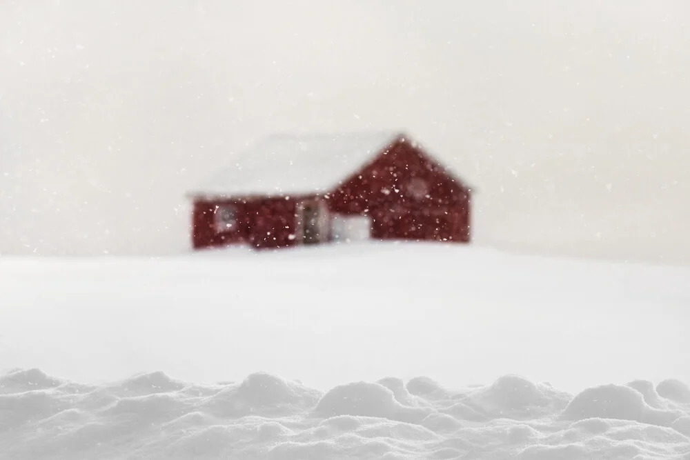 Fotokunst von Victoria Knobloch: Rote Hütte im Schnee, umgeben von Winterlandschaft in Norwegen.