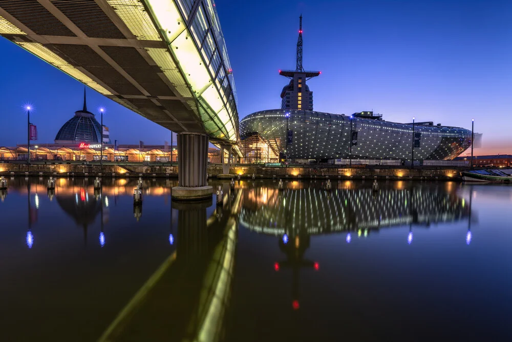Illuminated bridge of the Climate House in Bremerhaven during blue hour