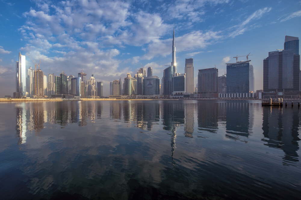 Photo art by Achim Thomae: Cityscape of Dubai featuring water and skyscrapers