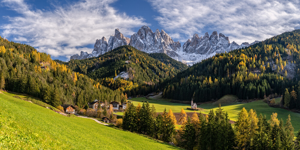 Photo art by Achim Thomae: autumn panorama with larches and Geisler peaks in South Tyrol