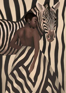 Illustration of a woman with a zebra in bold stripes, radiating calm and elegance.