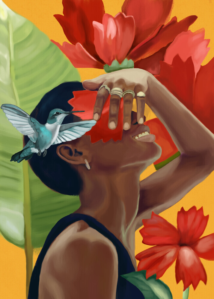 Illustration by Branka Kodžoman: a woman surrounded by blooming plants and a hummingbird.