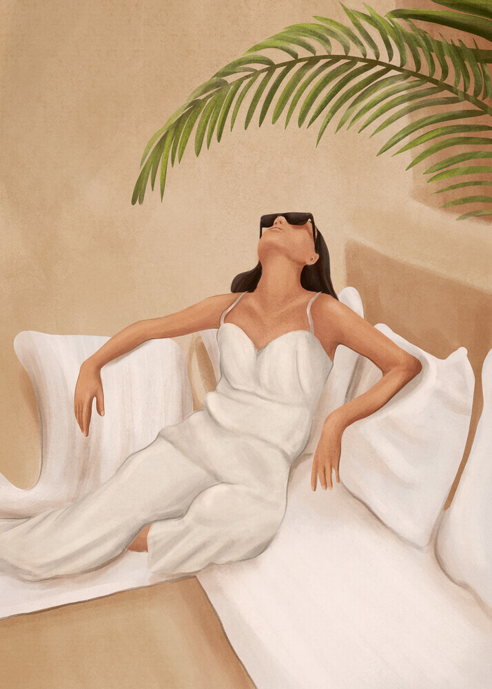 Illustration by Branka Kodžoman: Woman in a white dress enjoying summer heat under palm trees.