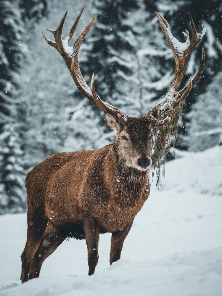 Mockup Deer in the snow with feed stock, soft colors and a calm atmosphere
