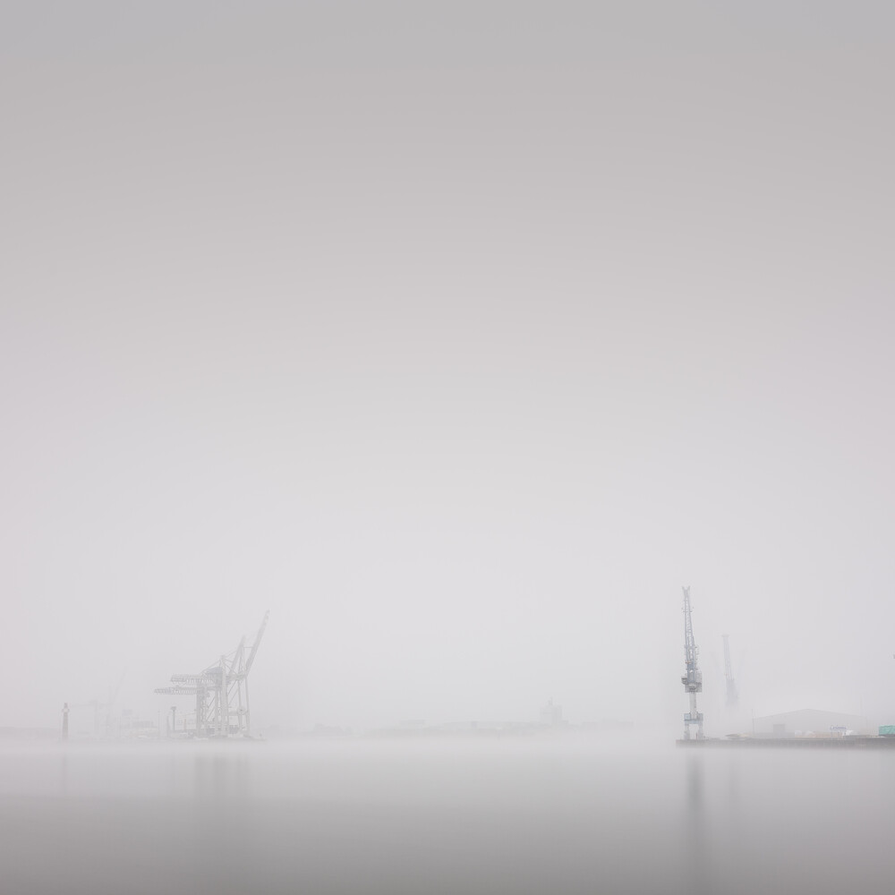 Photo art by Dennis Wehrmann: cranes in Hamburg harbor city during morning fog.