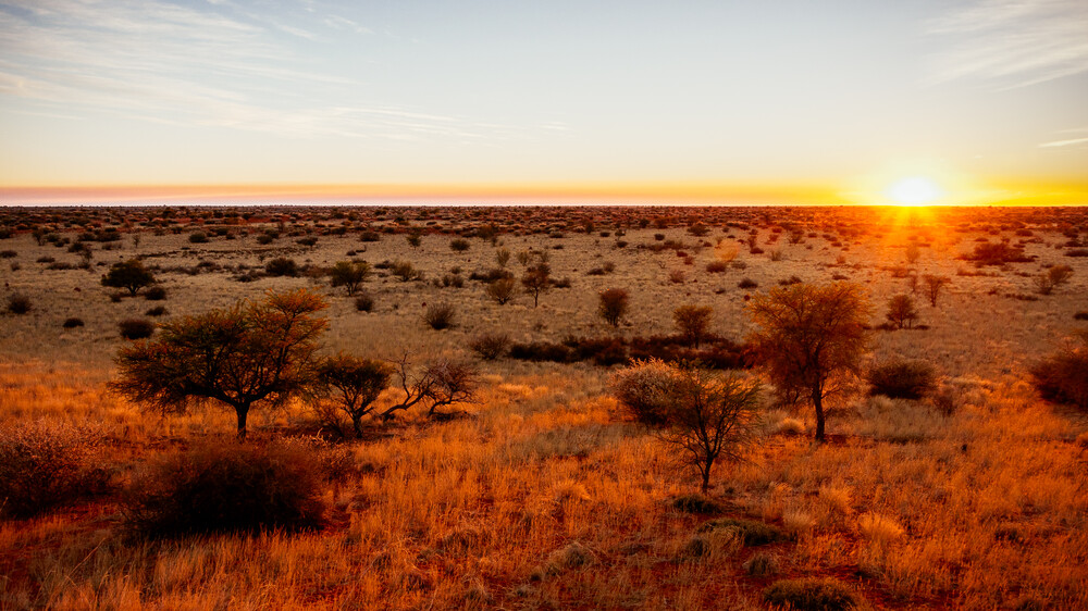 Sunrise in the Kalahari Desert with soft light rays and silhouetted trees