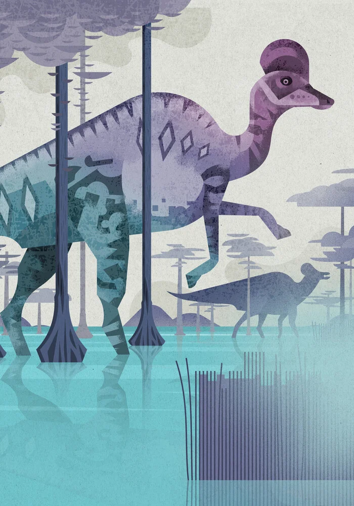 Illustration of a Corythosaurus in a swamp, soft colors and calm mood