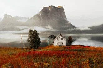 Mockup Photo art by Jonas Hafner: tranquil view of the fjord and fishing houses in Norway
