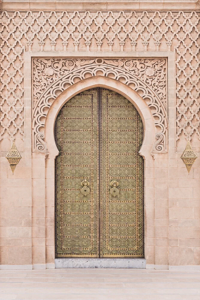 Intricate photo art of a Moroccan door adorned with golden patterns.
