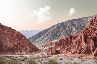 Colorful landscape with a rainbow over the Andes in Peru, gentle cloud formations in the sky.