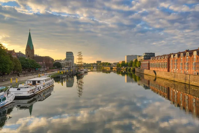 View across the Weser in Bremen: gentle morning light reflecting on the city and water.