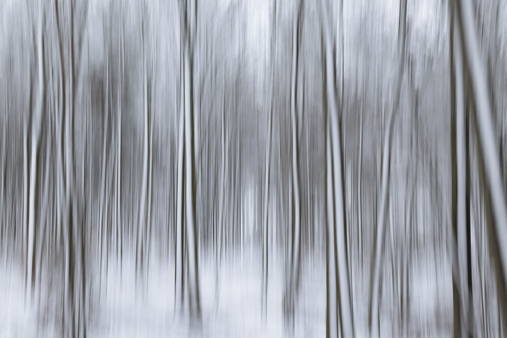 Blurred winter forest with snow: tranquil tree trunks in soft colors