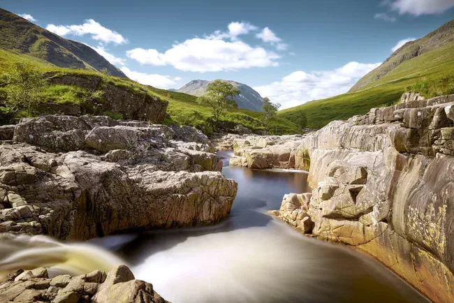Long exposure of Glen Etive in Scotland, gentle rivers and cloudy sky.