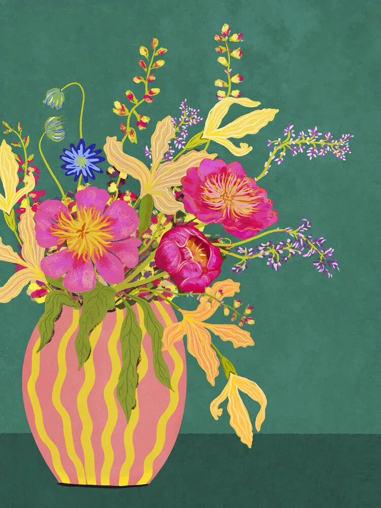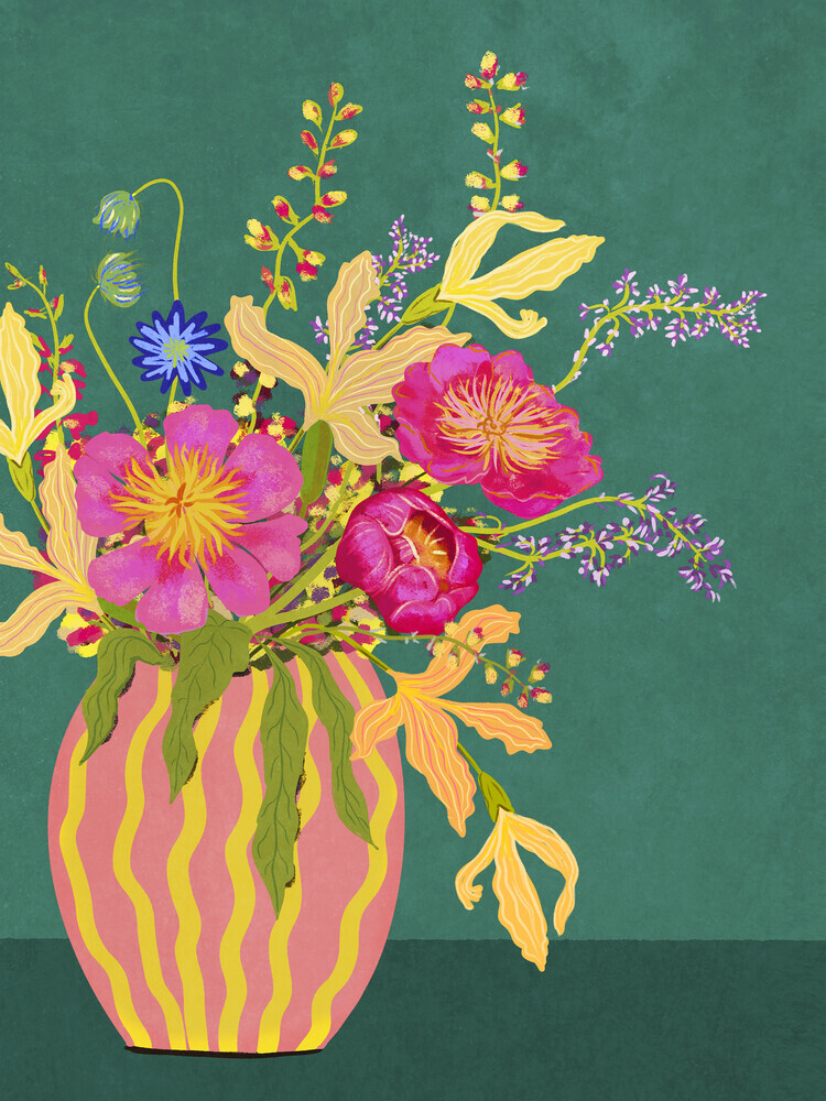 Illustration of a bouquet with peonies in a striped vase