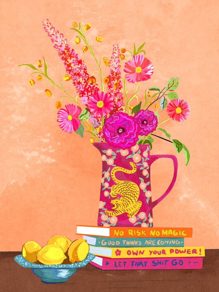 Illustration by Raissa Oltmanns: still life with vase, lemon, and flowers
