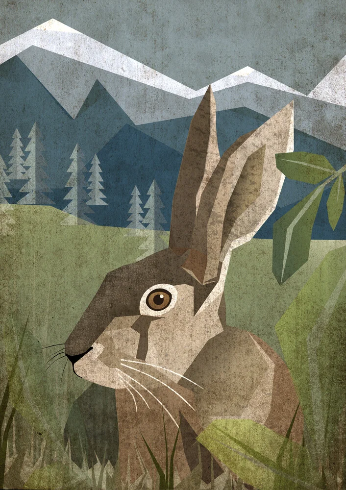 Illustration of a rabbit in nature, soft colors and a calm mood.