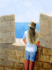Mockup Wall art by Sarah Morrissette: girl peacefully gazes at the sea and the Acropolis.