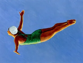 Illustration of a diver in a green swimsuit leaping into the blue sky.
