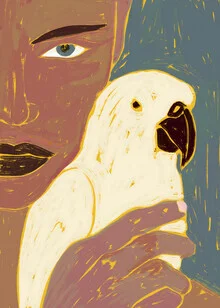 Mockup Illustration by Uma Gokhale: a woman with a parrot in soft colors.