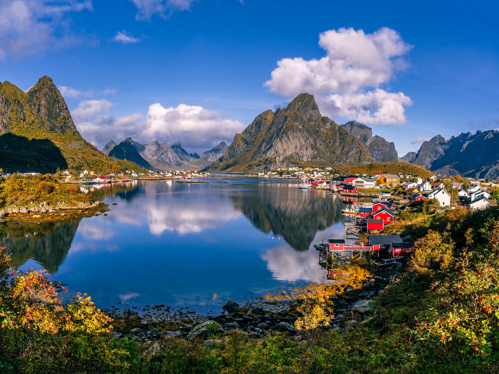 Photo art: Autumn scenes of fishing huts in Reine on the Lofoten islands