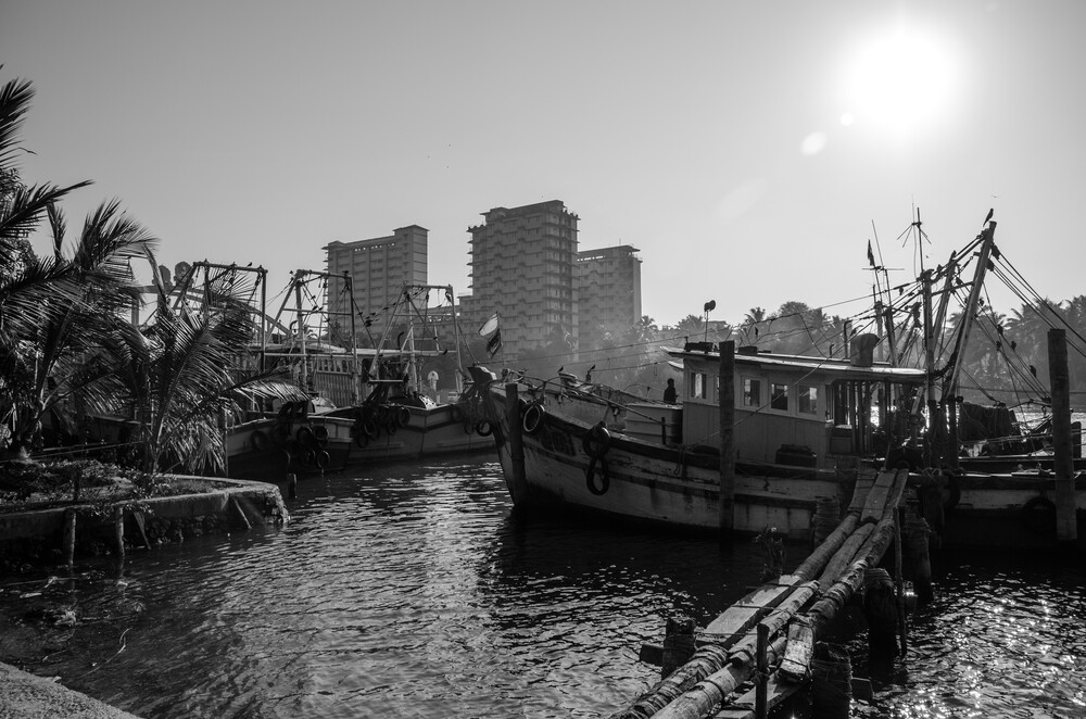 Mockup Moored fishing boats in calm water, surrounded by lush greenery