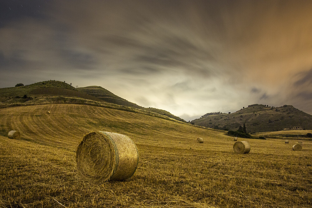 Photo art by Alessio Campo: tranquil landscape with hay bales and sunset in Sicily